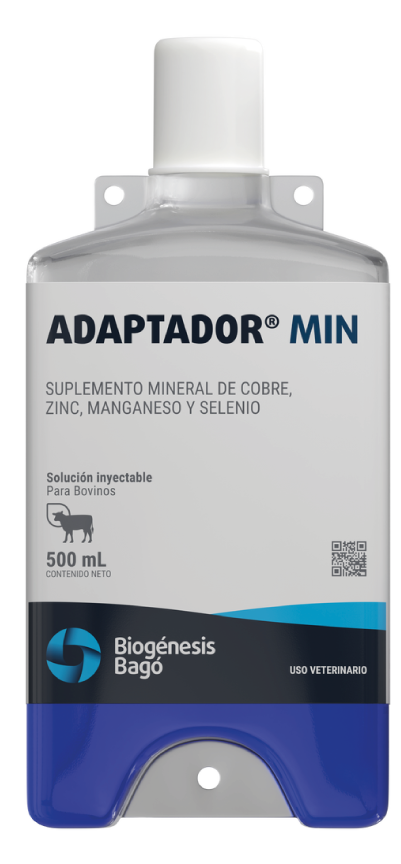 Adaptador MIN es una solución inyectable de microelementos que está indicada para la prevención y control del estrés oxidativo en terneros al destete, al inicio de un plan de inmunización y al ingreso de animales al feed-lot; así como otras situaciones que pudiesen generar la formación de radicales superóxido, como por ejemplo el transporte.